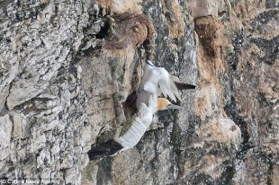 A gannet was seen hanging 400ft in mid-air from a cliff face in North Yorkshire after trapping its wing in a nest